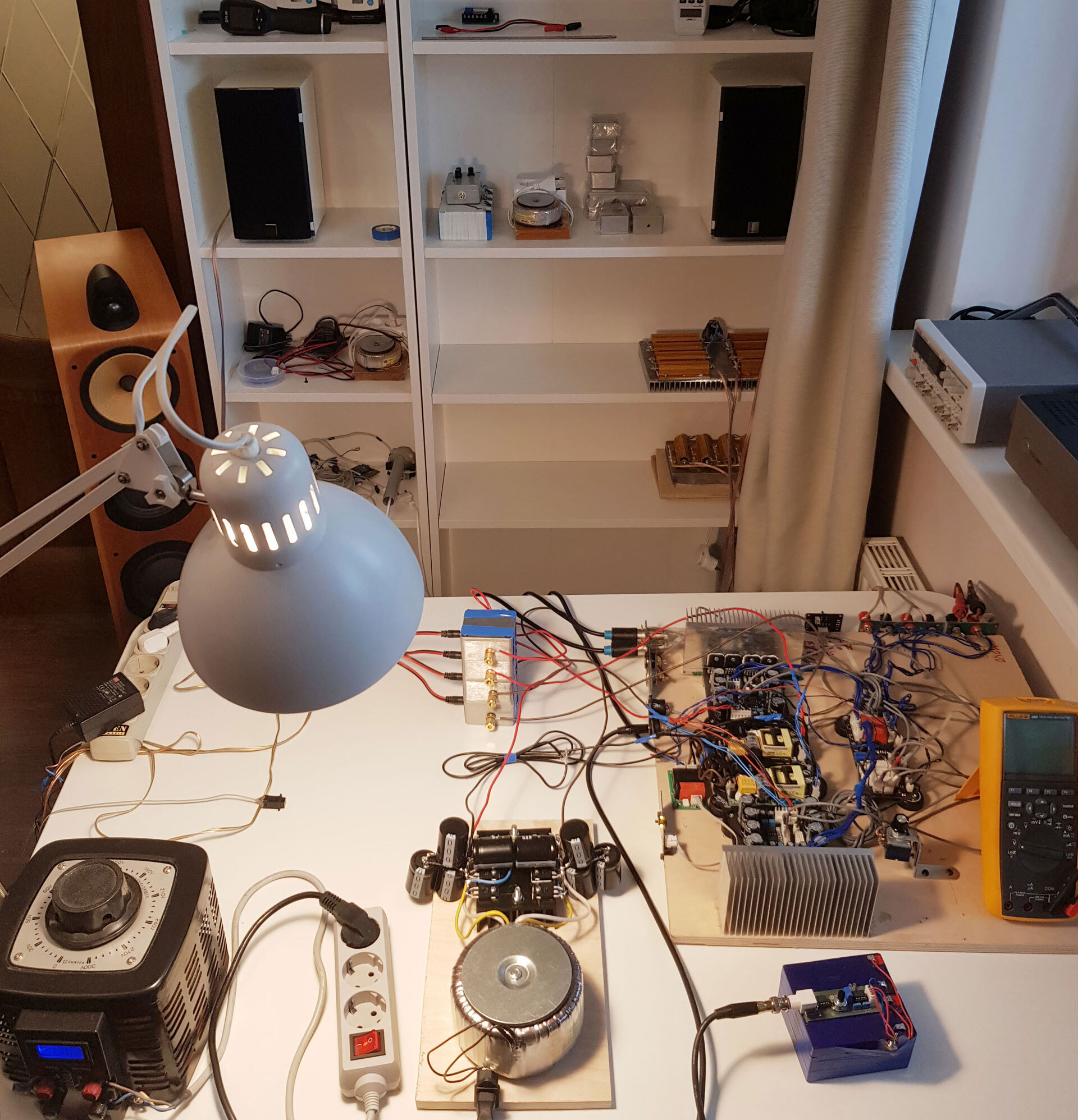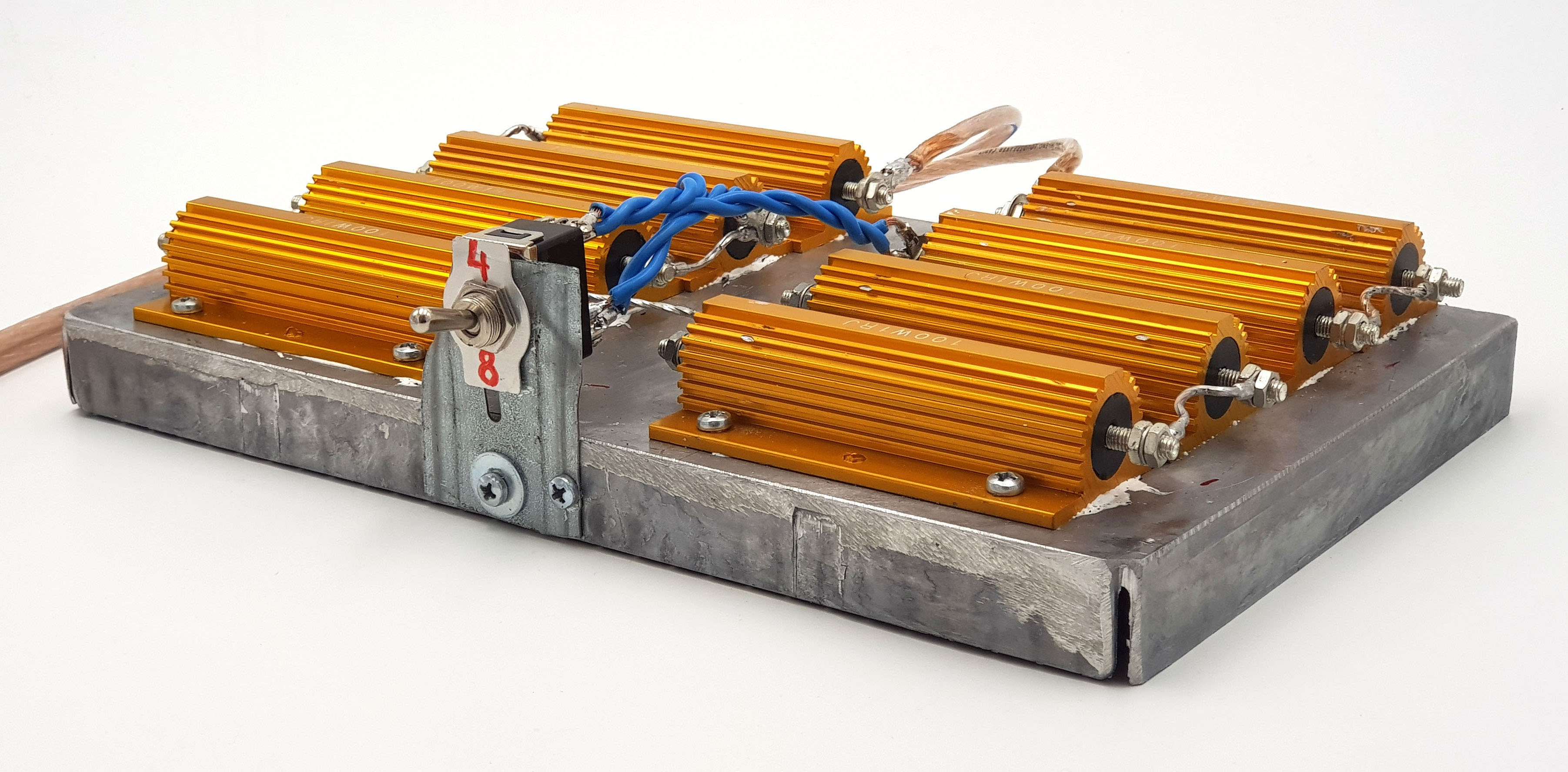 Это блок высокомощных резисторов по 1Ω, который используются, чтобы получить 4Ω или 8Ω нагрузки. Мы проведём три исследования: исследование работы блоков питания при нагрузке усилителя синусоидальным сигналом, измерение технических характеристик усилителя и субъективное сравнение звучания усилителя, к которому попеременно подключаются импульсный и трансформаторный блоки питания.