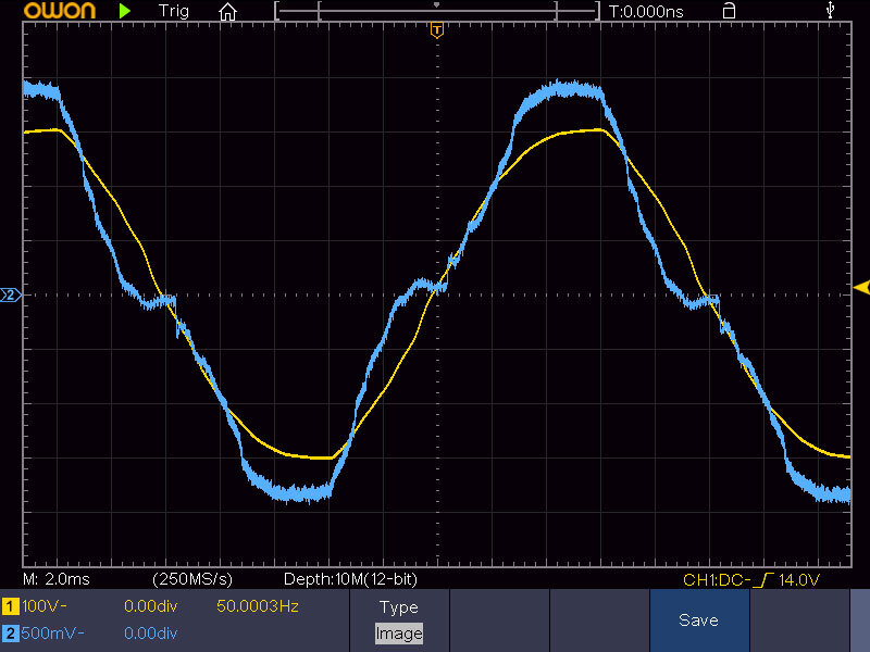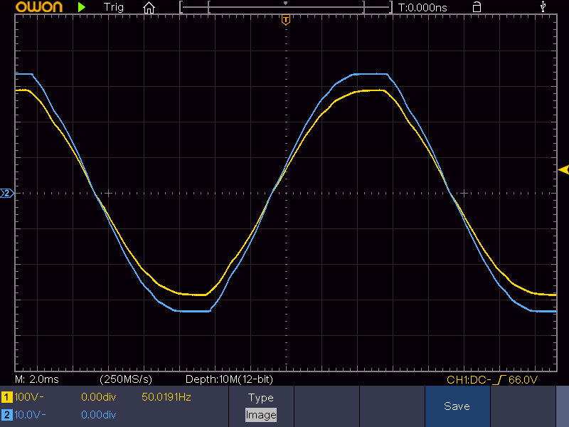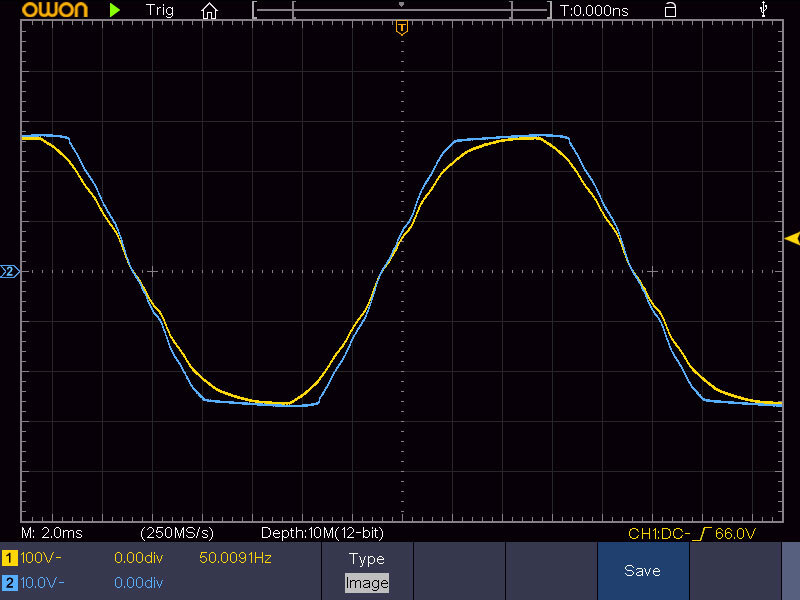 А теперь посмотрим осциллограммы работы трансформатора без нагрузки и под нагрузкой. Жёлтая линия — напряжение на первичной обмотке (сетевое), голубая — напряжение на вторичной обмотке (отдаваемое).