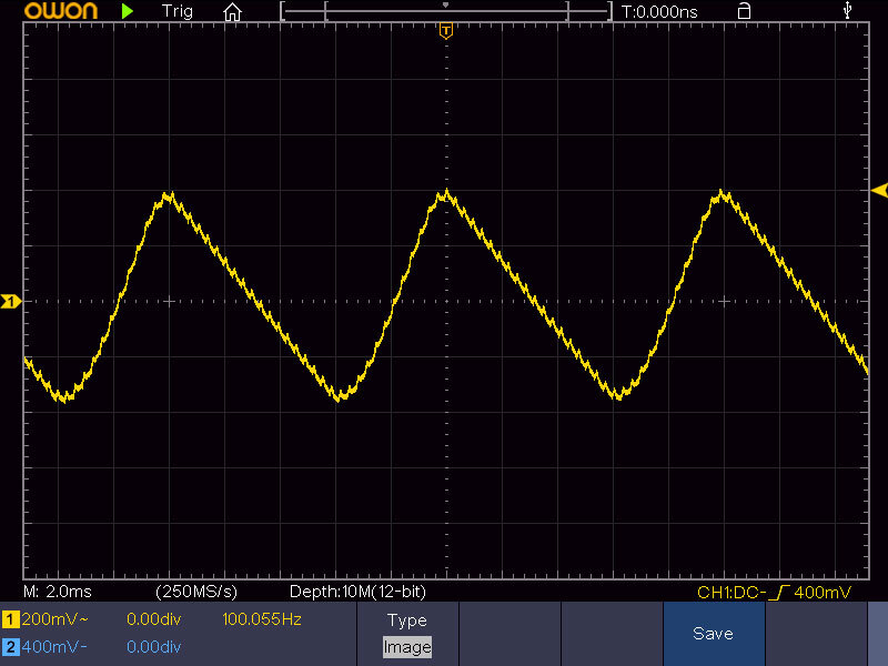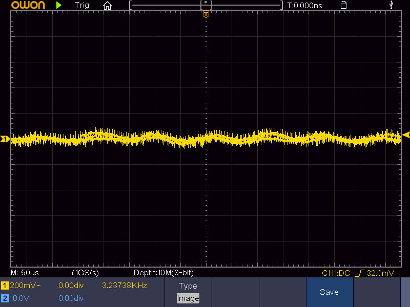Теперь проверим, насколько чистое питание выдаётся в усилитель. Осциллограмма пульсаций напряжения ТБП под нагрузкой: