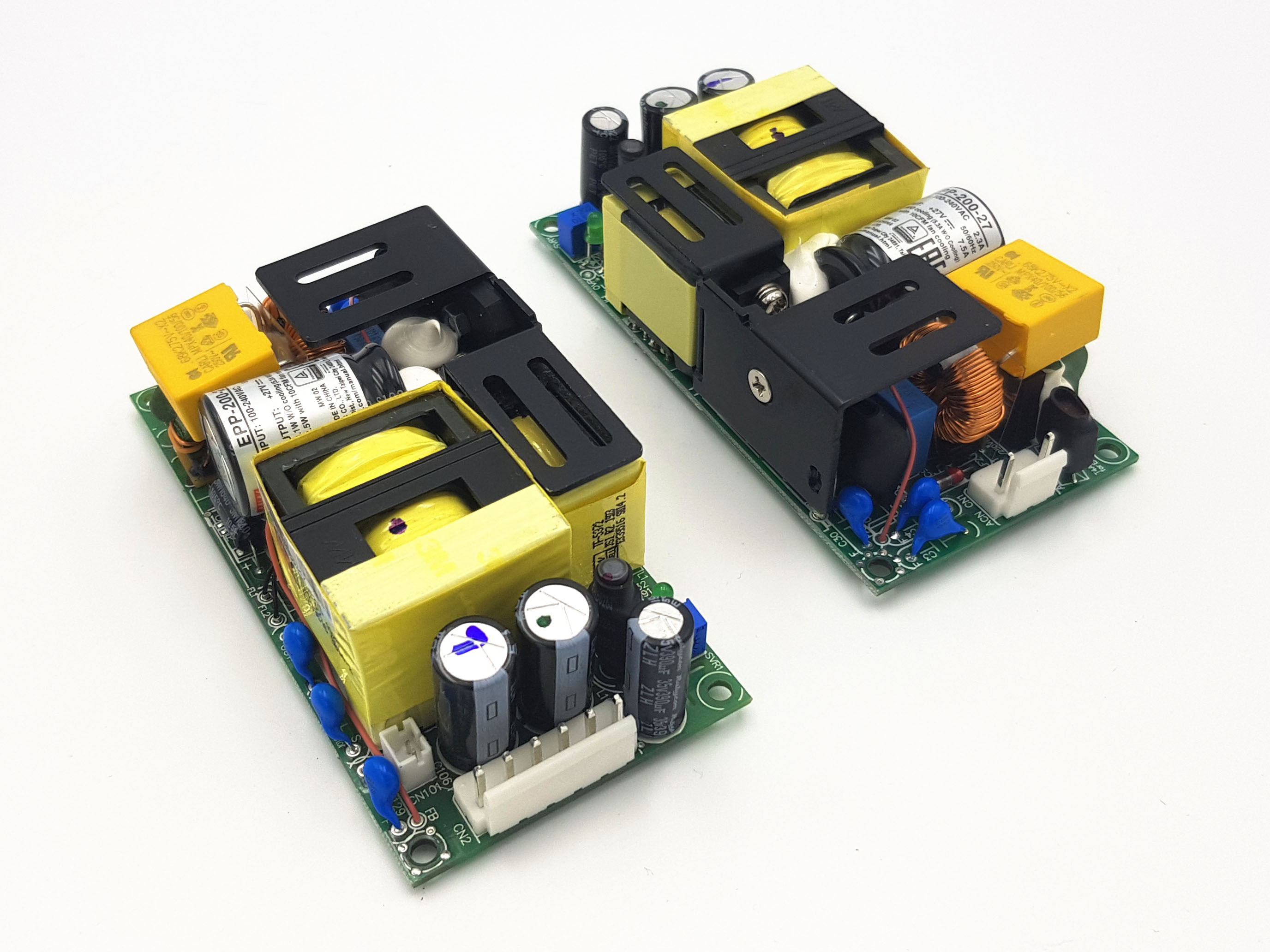 Два импульсных блока питания Meanwell EPP-200-27. Два, потому что для питания усилителя нужно двухполярное напряжение ±30В, а один такой блок выдает напряжение одной полярности. Номинальная мощность этого блока питания 200W, итого получаем 400W мощности. Общая масса блоков питания 380 грамм.