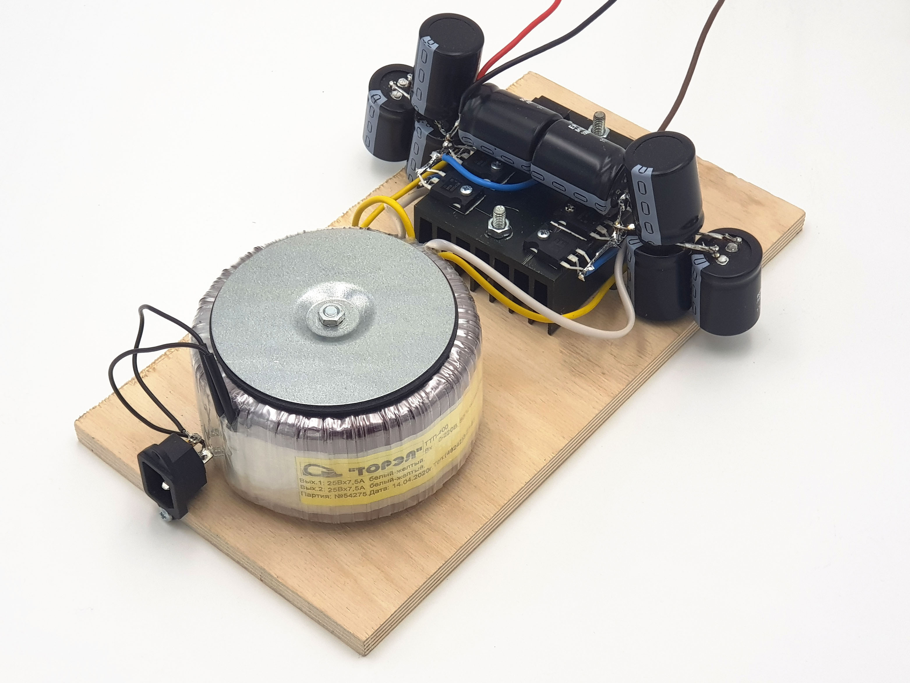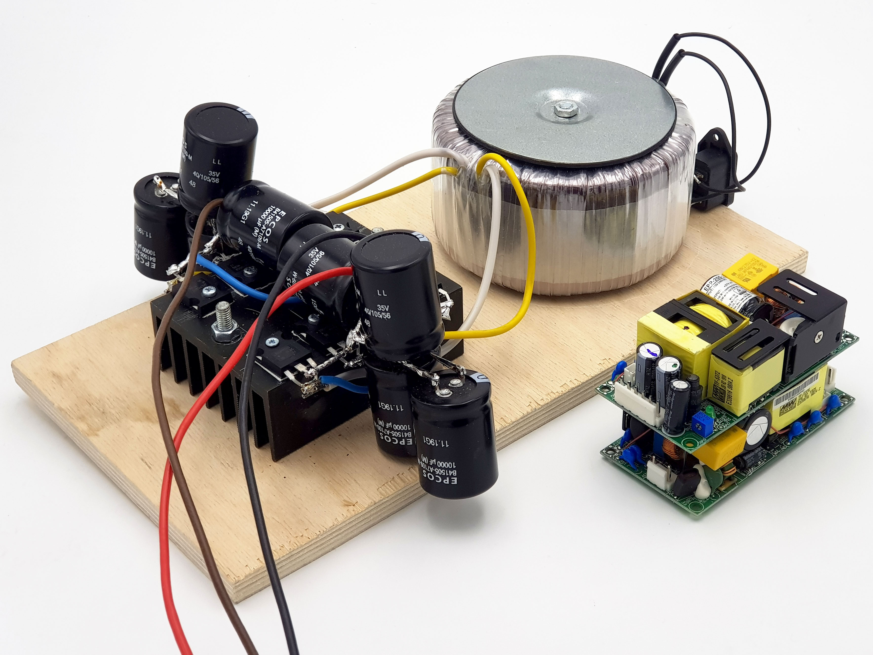 И трансформаторный блок питания, сделанный из трансформатора ТТП400 (2x25В, 7.5А) с номинальной мощностью 400W, двух выпрямительных мостов на диодах Шоттки и батарей сглаживающих конденсаторов по 40000 мкф в плечо. Это классическая схема питания, применяемая испокон веков и до наших дней. Масса одного только трансформатора, без учёта всего остального — 4.1 килограмм.