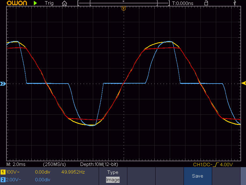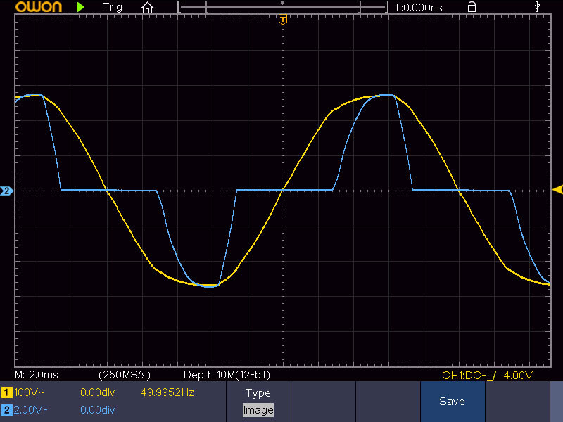 Как вы видите, форма сетевого напряжения не меняется, а напряжение на вторичной обмотке обрезается на пиках, как раз в тот момент, когда происходит потребление тока:
